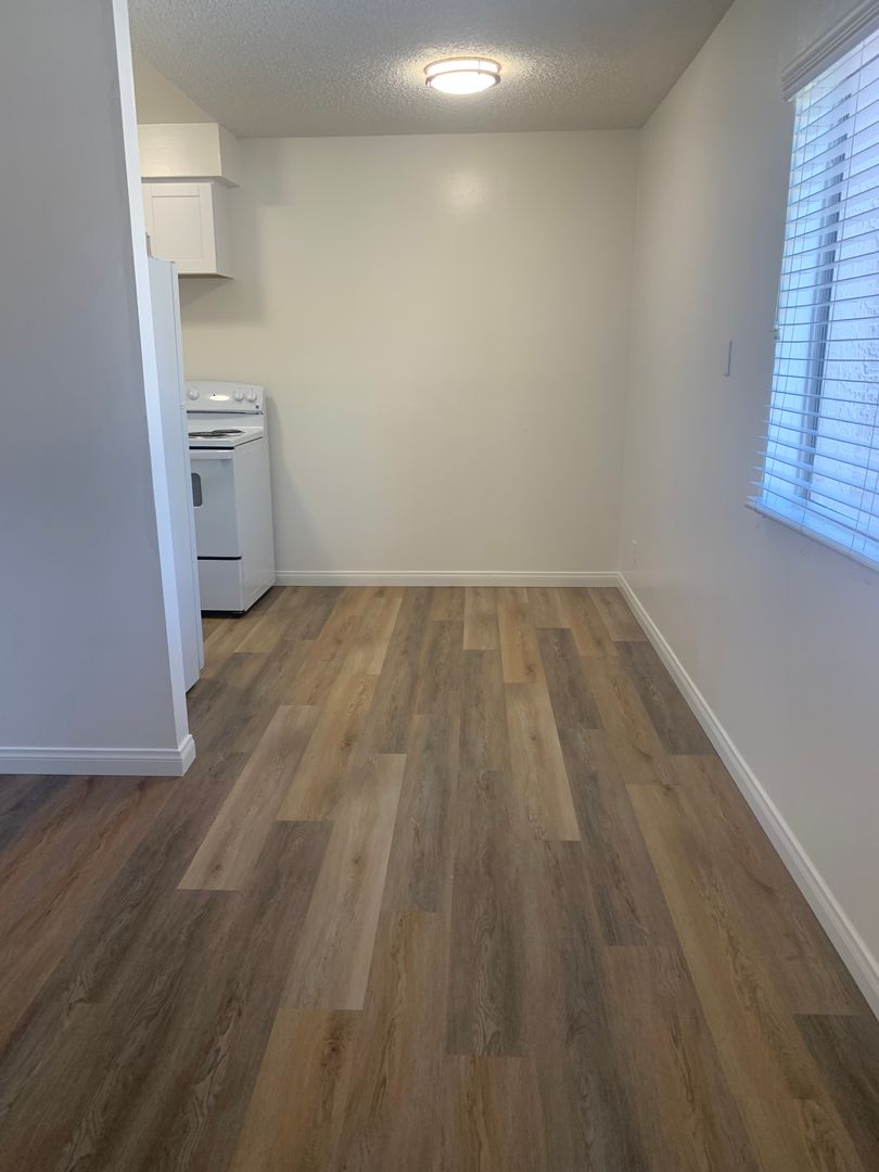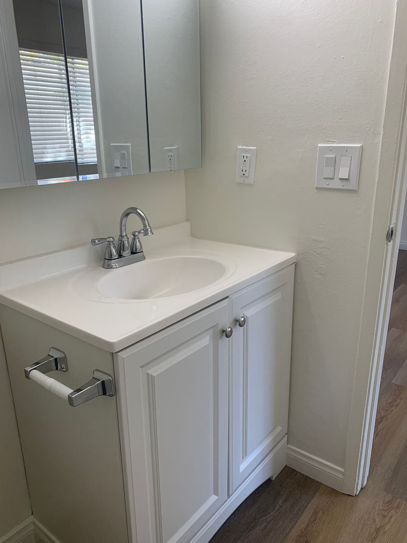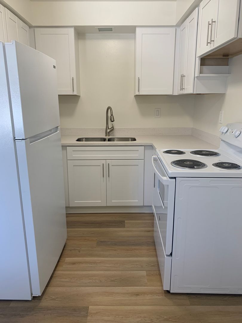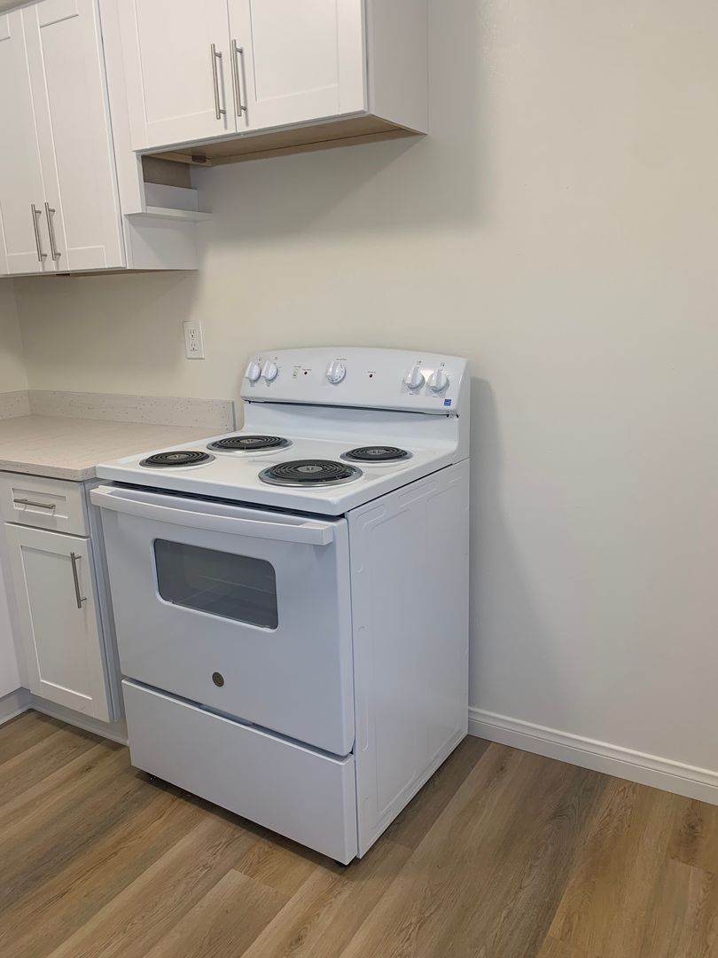 This updated, all-electric downstairs one-bedroom apartment offers modern comfort and functionality. Features include vinyl wood-grain flooring throughout, a renovated kitchen with new cabinets, countertops, sink, and stove, plus new window blinds. The bathroom has also been upgraded with a new vanity, tub/shower, and surround for a clean, refreshed look.